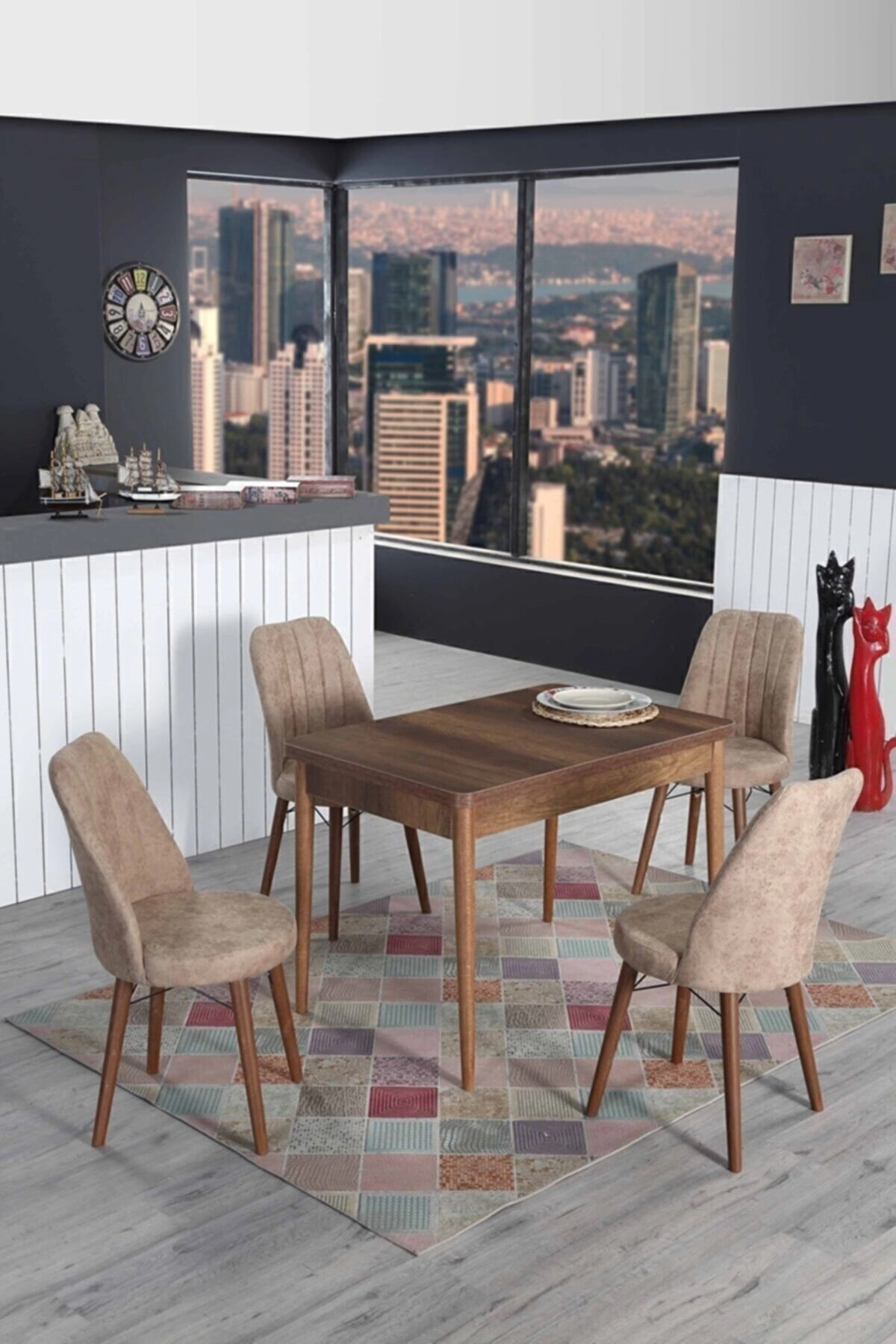 Suntalam malzemesi sayesinde uzun ömürlü ve dayanıklı kullanım sunar Sabit masa tasarımı, mutfakta stabil ve güvenli bir yemek deneyimi sağlar Jerry kumaş kaplama, sandalyelerin konforunu artırırken kolay temizlenebilir özelliğiyle pratiklik sağlar Turkuaz renk seçeneğiyle mutfak dekorasyonunuza canlılık ve şıklık katar Retro stil tasarımı, nostaljik ve sıcak bir atmosfer yaratır