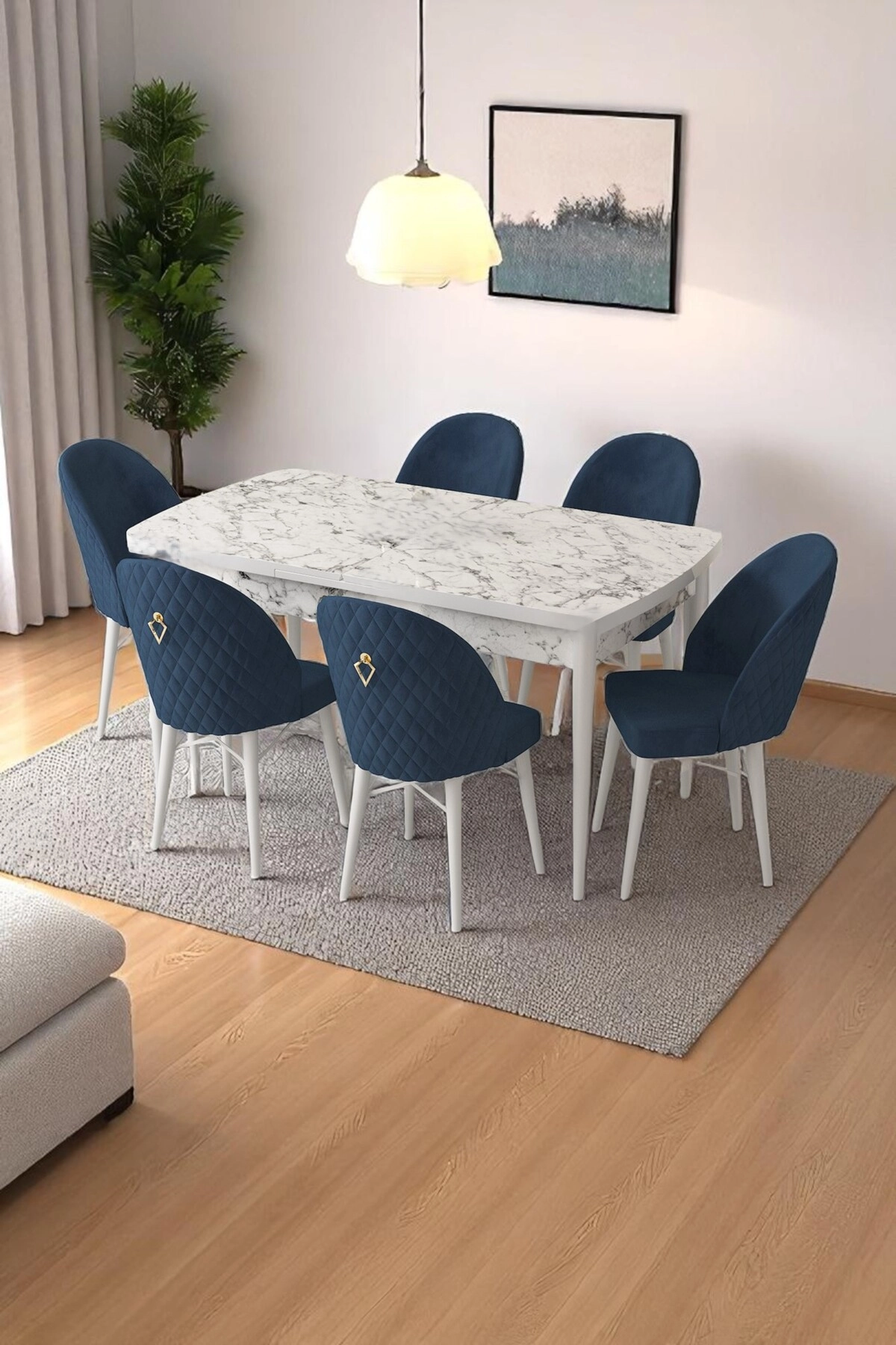 Mia Serisi Açılabilir Mutfak Masası Takımı Beyaz Mermer Desen Masa 6 Sandalye, Yemek Masası