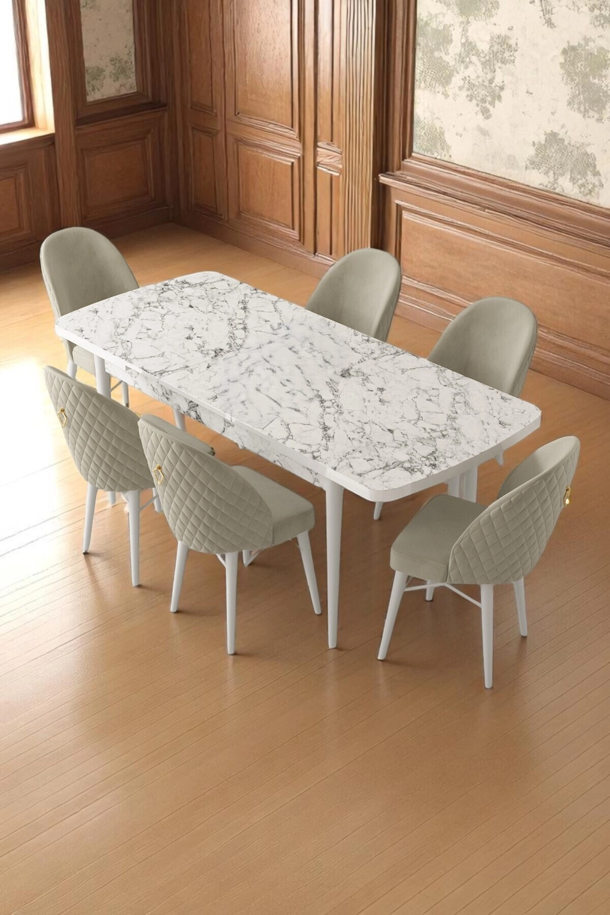 Mia Serisi Açılabilir Mutfak Masası Takımı Beyaz Mermer Desen Masa 6 Sandalye, Yemek Masası