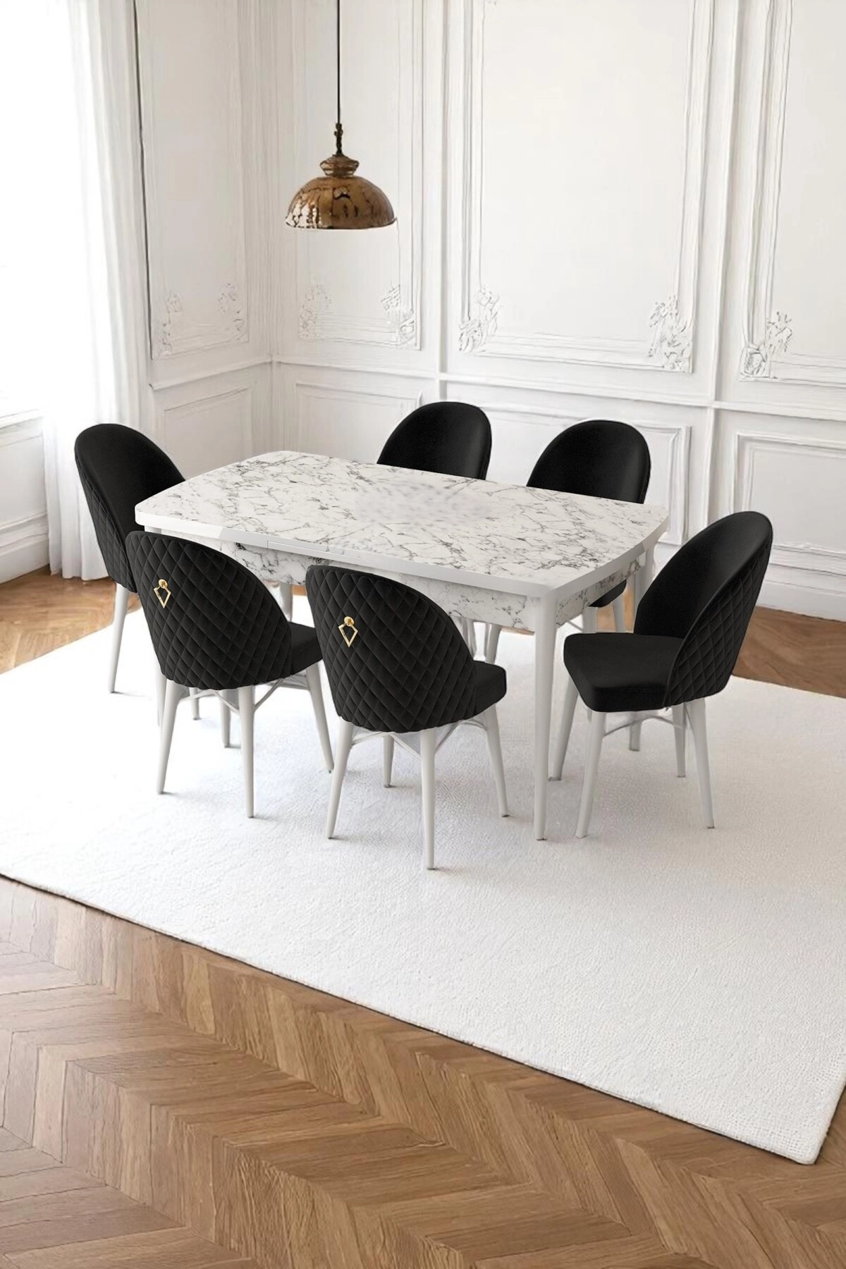 Mia Serisi Açılabilir Mutfak Masası Takımı Beyaz Mermer Desen Masa 6 Sandalye, Yemek Masası