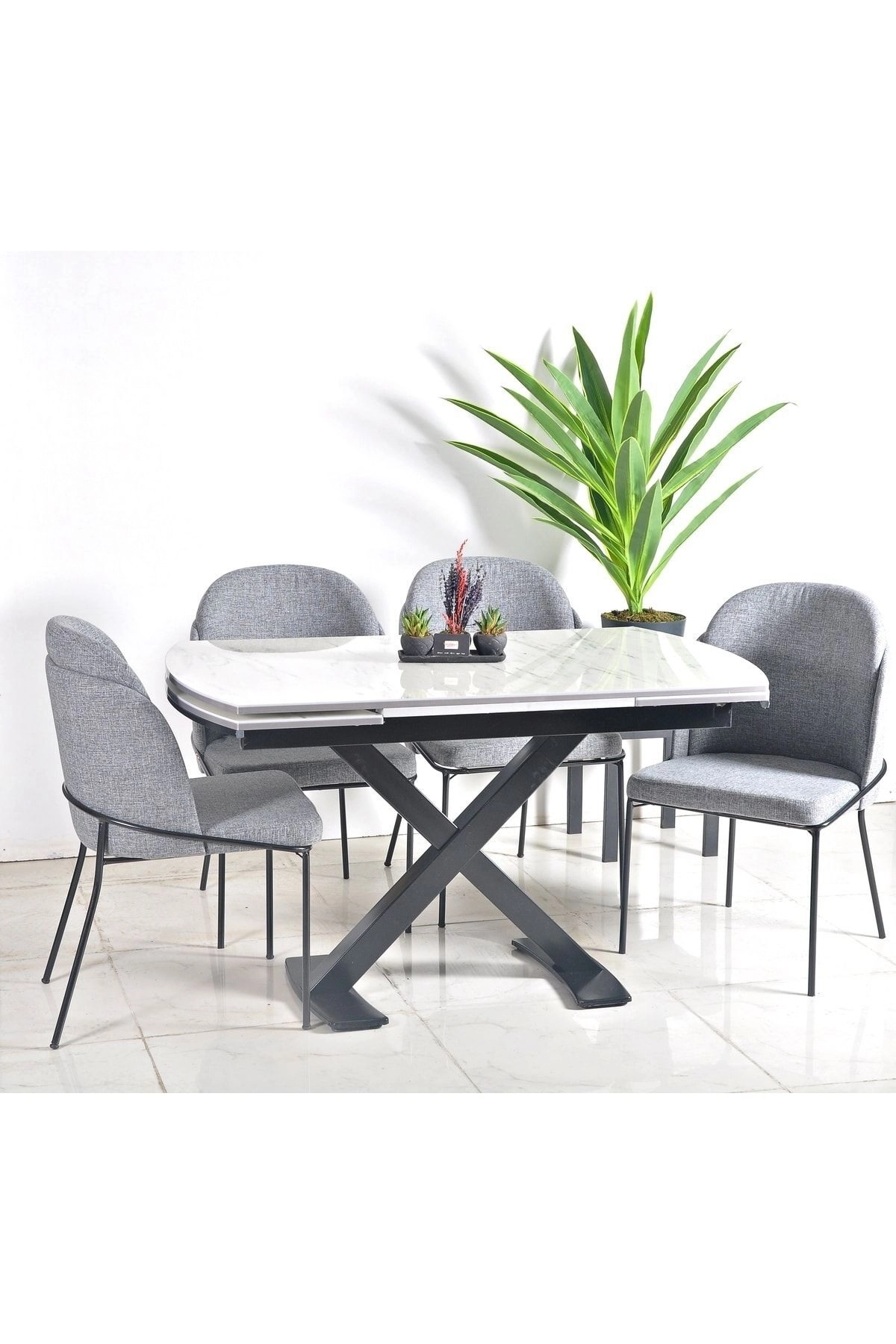 4 Kişilik X Ayaklı Masa Sandalye Takımı Masa Malzemesi : Mdf & Yüzey Lamigloss Kaplama Cam Parlaklığında Yanma Ve Çizilmeye Karşı Dayanıklı Yüzey Masa Ayağı : 2 mm Demir Profil Masa Ölçüsü : Sabit Hali 80x130 cm Açık Hali 80x190 cm Masa İki Baştan Kolay Mekanizma İle Açılmaktadır.