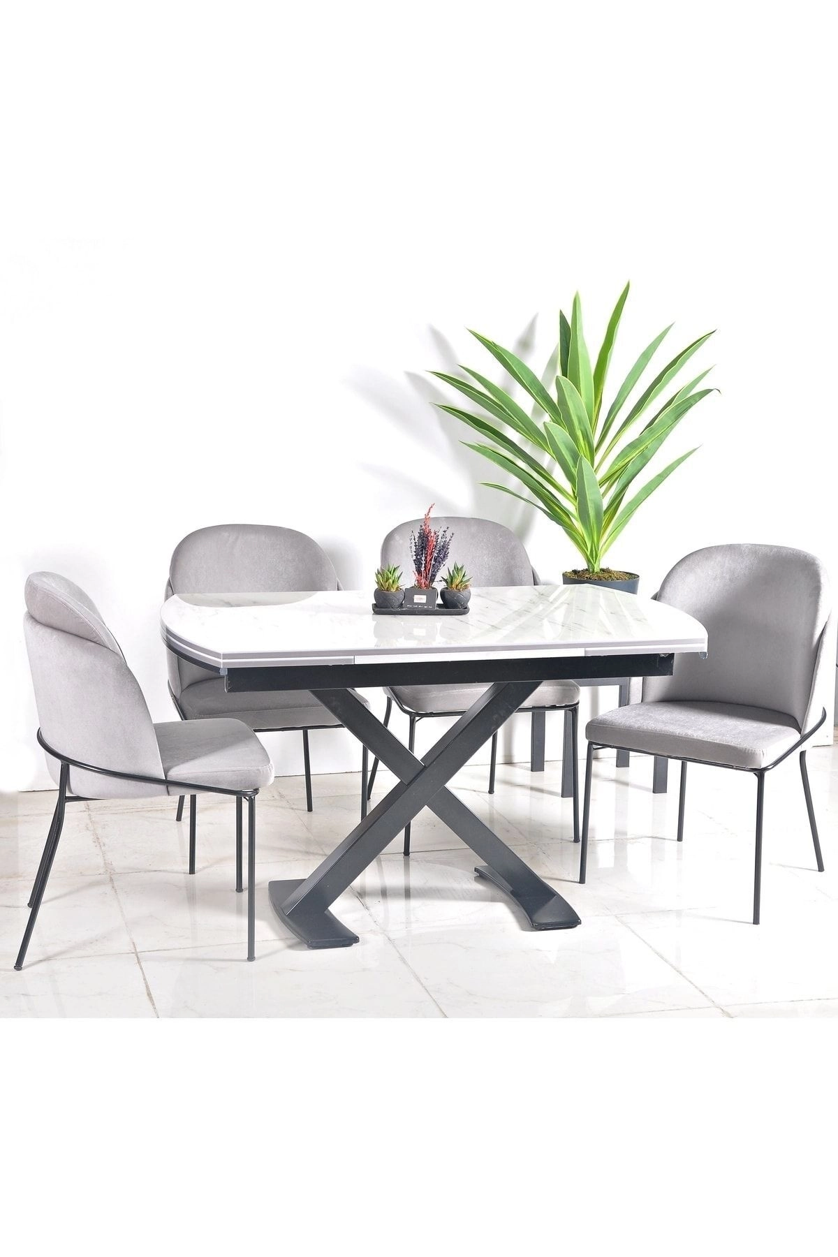 6 Kişilik X Ayaklı Masa Sandalye Takımı Masa Malzemesi : Mdf & Yüzey Lamigloss Kaplama Cam Parlaklığında Yanma Ve Çizilmeye Karşı Dayanıklı Yüzey Masa Ayağı : 2 mm Demir Profil Masa Ölçüsü : Sabit Hali 80x130 cm Açık Hali 80x190 cm Masa İki Baştan Kolay Mekanizma İle Açılmaktadır.