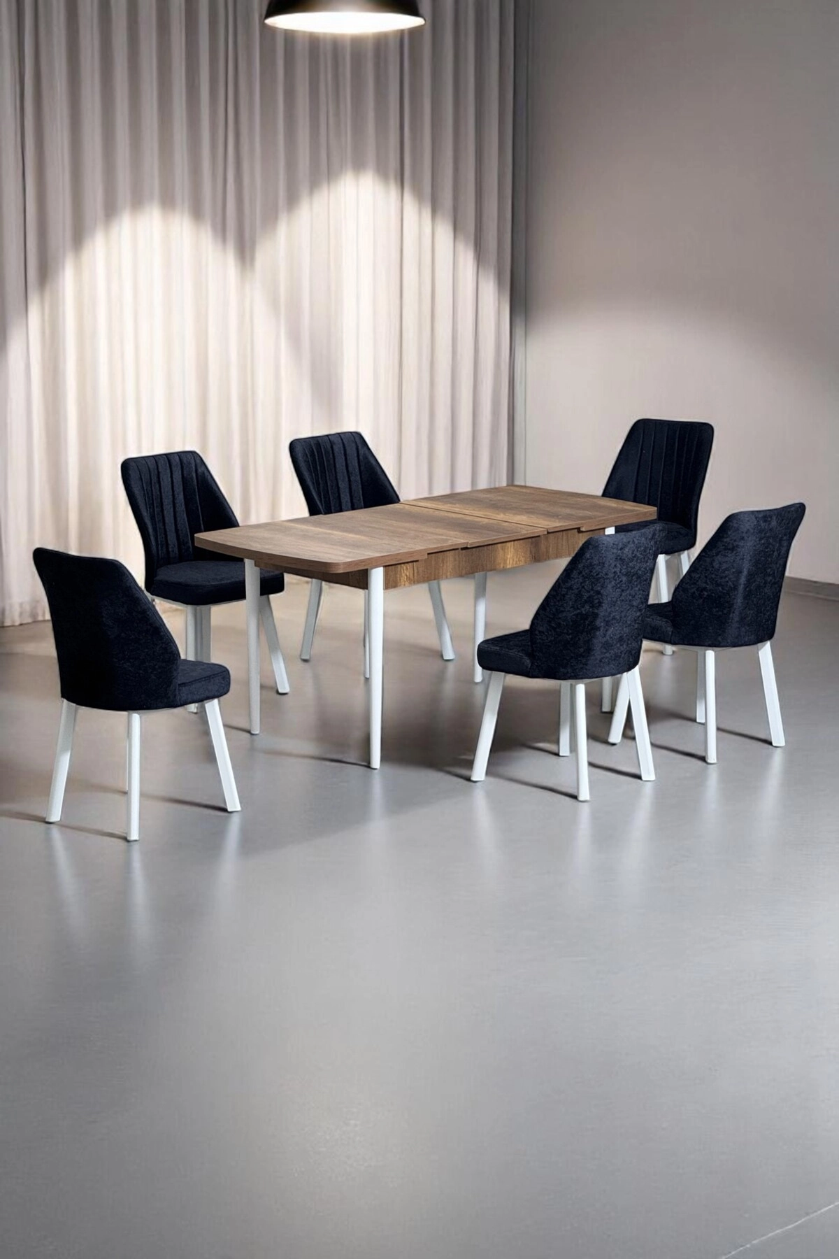-Altı adet siyah sandalye ile tamamlanan set, modern mutfak dekorasyonlarına uyum sağlar.